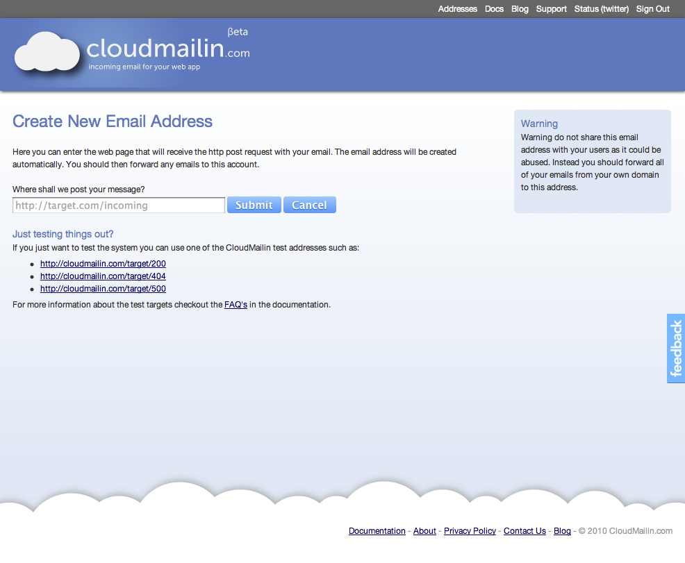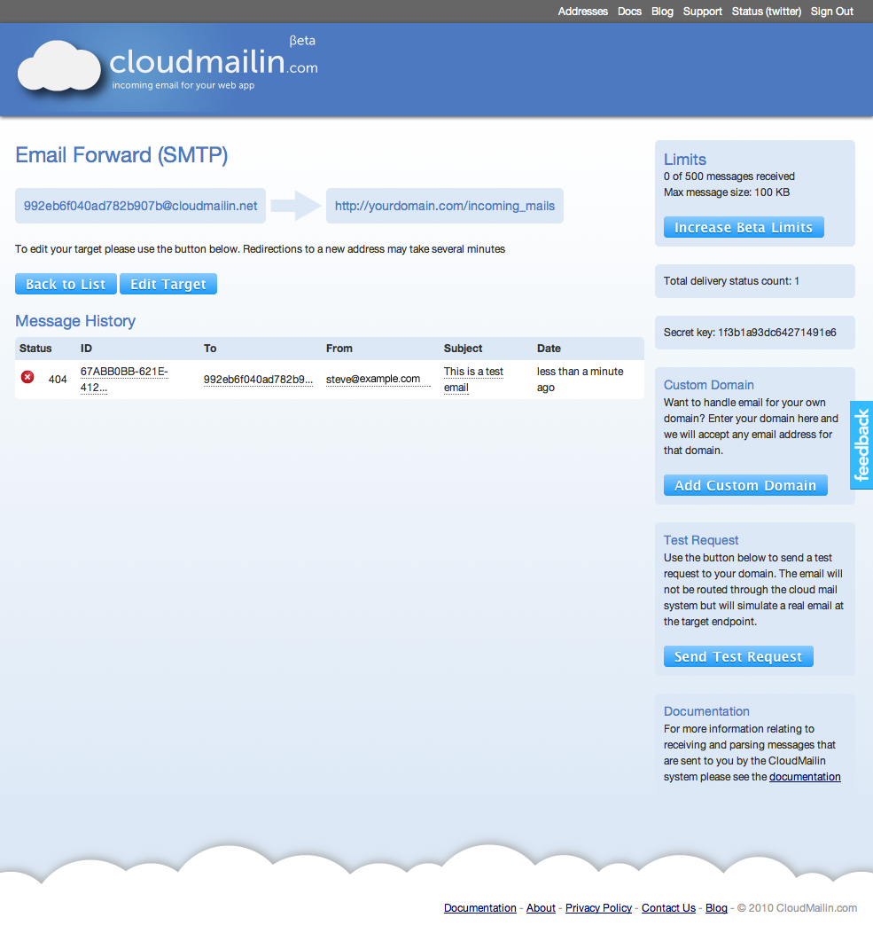 As soon as you sign up, you will be presented with the option to create your CloudMailin address. Here you enter the url of page that you wish to receive your email via HTTP Post at. After you click submit, an email address will be generated for you and anything you send to that email address will be sent to your website. Once you click the submit button, the site will generate your email address and you will be ready to go. You will be redirected to the address list page. Here you can see each of your CloudMailin addresses, the target, that your HTTP Post will be sent to when an email is received and the plan details. Each CloudMailin address sits in its own plan so you can have different allocations for each address and therefore web app you want to receive email within. Currently the site is in beta so there is only one free plan. However once the site launches, there should always be a free plan to get started. If you click on the address listed in the address list, you are taken to the page for that address. On this page are a number of configuration options for the address but also the delivery status list. The delivery status list is a powerful feature that allows you to see each email that passes through the system and the status of that message. So lets go ahead and send an email to the address that CloudMailin has given us. We should almost instantly get a response back saying that the message delivery has failed.